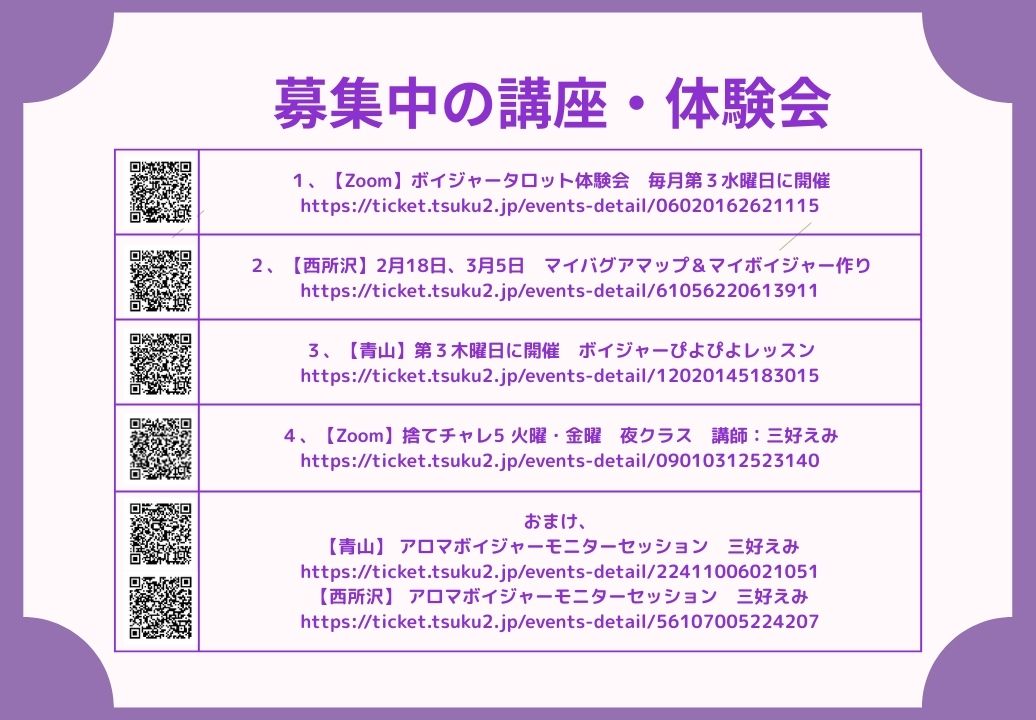 NEWS お知らせ 新月のメッセージ&体験会・講座のご案内 新月のメッセージ&体験会・講座のご案内 • 2026年2月17日 • 新月のメッセージと講座情報 今年も開催|マイバグアマップ&マイボイジャー作り(2月・西所沢) 今年も開催|マイバグアマップ&マイボイジャー作り(2月・西所沢) • 2026年1月19日 • ボイジャータロット お年玉&えみバースデーセール 1月15日まで開催! お年玉&えみバースデーセール 1月15日まで開催! • 2026年1月12日 • 未分類 クリスタルがあなたのもとに行きたがっています クリスタルがあなたのもとに行きたがっています • 2025年12月22日 • ボイジャータロット 【まだ間に合います】捨てチャレ5 で家のエネルギーを高めましょう! 【まだ間に合います】捨てチャレ5 で家のエネルギーを高めましょう! • 2025年11月30日 • おそうじ風水 【実話】空間マジックで理想のパートナーと生き方を手に入れた2人 【実話】空間マジックで理想のパートナーと生き方を手に入れた2人 • 2025年11月28日 • おそうじ風水 【家のエネルギーを整えてパワーアップしませんか?】 【家のエネルギーを整えてパワーアップしませんか?】 • 2025年11月26日 • おそうじ風水 おそうじ風水ってなあに?という疑問にお答えします/ zoom訂正 おそうじ風水ってなあに?という疑問にお答えします/ zoom訂正 • 2025年11月25日 • おそうじ風水 京都&宝塚を満喫しました 京都&宝塚を満喫しました • 2025年11月24日 • 旅のアルバム 心もおうちもスッキリ!運気がめぐる“捨てチャレ5”募集開始! 心もおうちもスッキリ!運気がめぐる“捨てチャレ5”募集開始! • 2025年11月14日 • おそうじ風水 さあ、11月は紅葉の京都&兵庫へ! さあ、11月は紅葉の京都&兵庫へ! • 2025年10月26日 • ボイジャータロット ボイジャータロットを体験しませんか?10月10日、新所沢陶板浴ルミアンへGo! ボイジャータロットを体験しませんか?10月10日、新所沢陶板浴ルミアンへGo! • 2025年10月9日 • ボイジャータロット