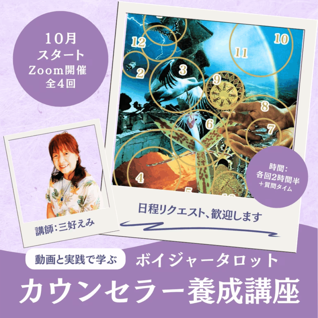 SCHEDULE スケジュール 【青山】10月16日(木曜日) ボイジャー勉強会:ホールセルフマンダラ 講師:三好えみ 詳細はこちら 【Zoom】10月10日 ボイジャー勉強会 スターツリー 講師:三好えみ 詳細はこちら 【Zoom】10月スタート ボイジャーカウンセラー認定講座 講師:三好えみ 詳細はこちら